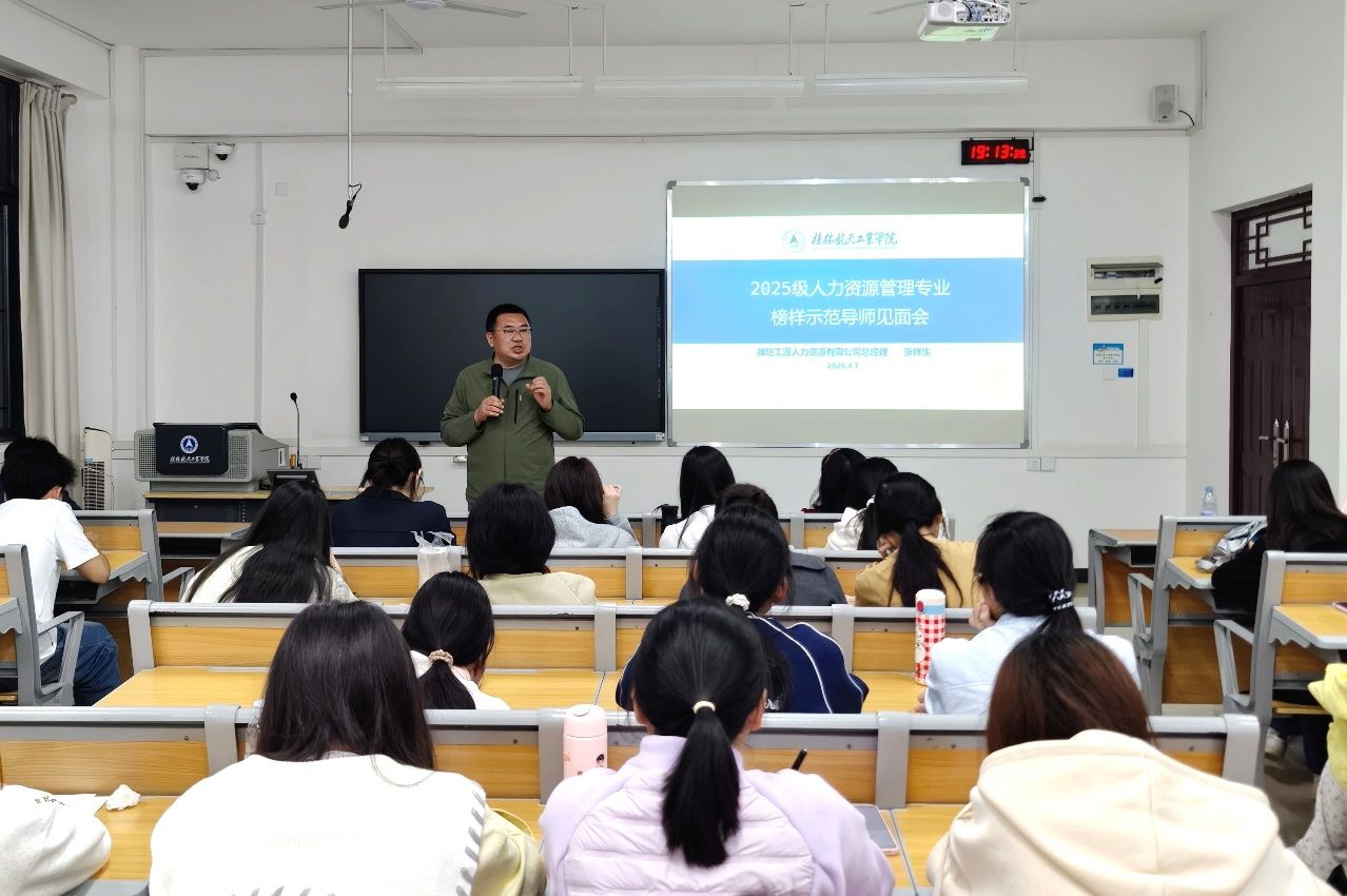 4月7日晚,管理学院在探天A416教室举行榜样示范导师见面会。特邀我校2000级校友、潍坊工源人力资源有限公司总经理张祥生,为2025级人力资源管理专业学生带来一场内容丰富、指导性强的经验分享。见面会由管理学院分管学生工作负责人主持。