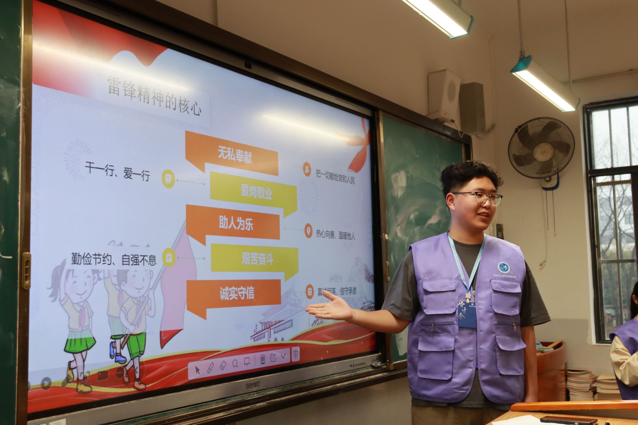活动在庄严的国歌声中拉开帷幕。学生党员黄尧和团员干部吕璟宁以生动讲述引入雷锋故事,带领小学生齐声朗读雷锋事迹,感悟榜样力量。现场设置知识问答、团队协作游戏及“小小志愿者”角色扮演等互动环节,学生在党员与团员志愿者的引导下踊跃参与,在体验中体会助人之乐。