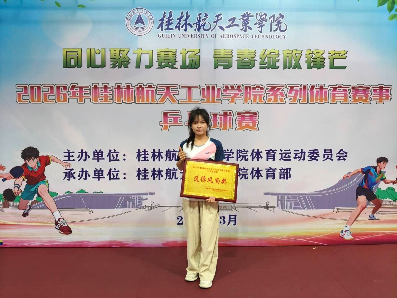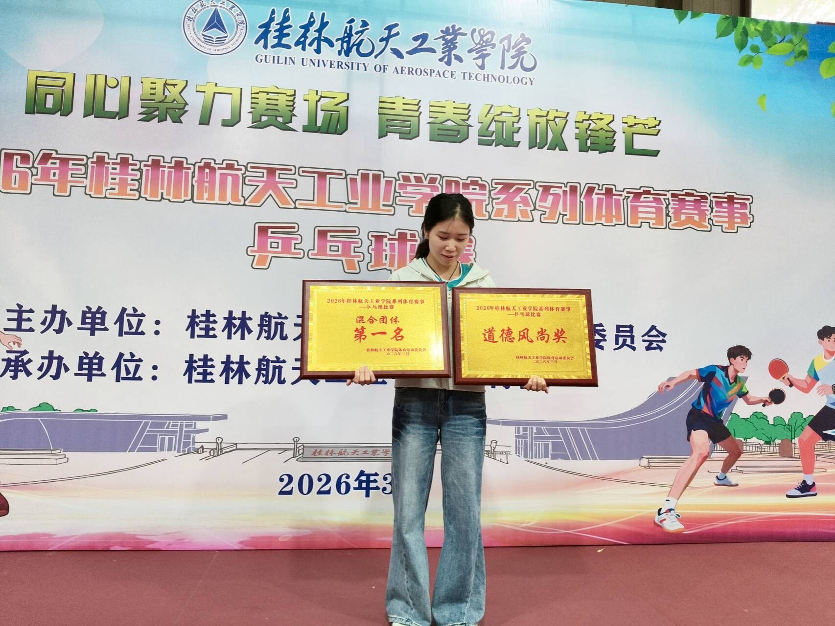 2026年3月29日,2026年桂林航天工业学院系列体育赛事——乒乓球比赛落下帷幕。管理学院代表队积极参与、认真备赛,在混合团体及男单、女单项目中均展现出良好竞技状态,最终在所参赛项目中均获得冠军,同时荣获“道德风尚奖”。