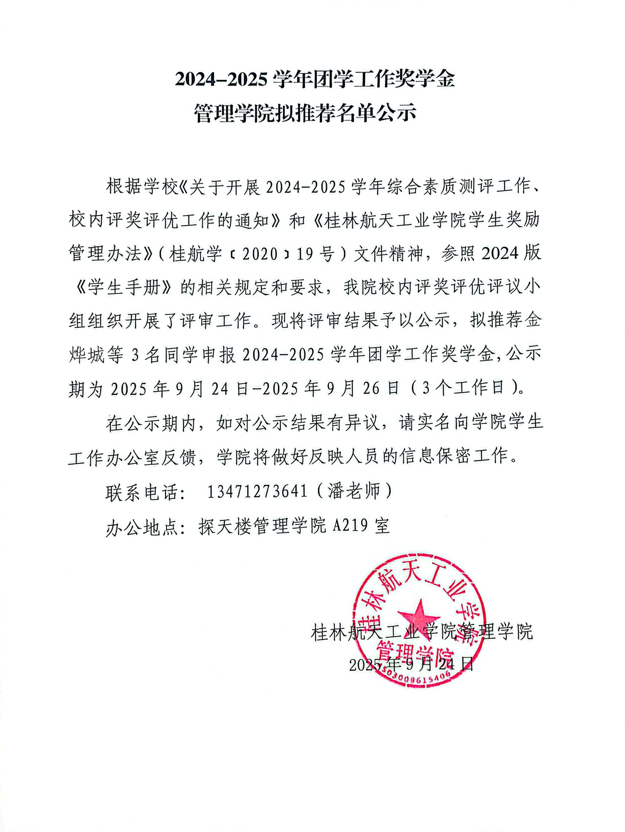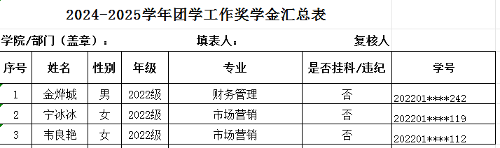 2024-2025学年团学工作奖学金管理学院拟推荐名单公示