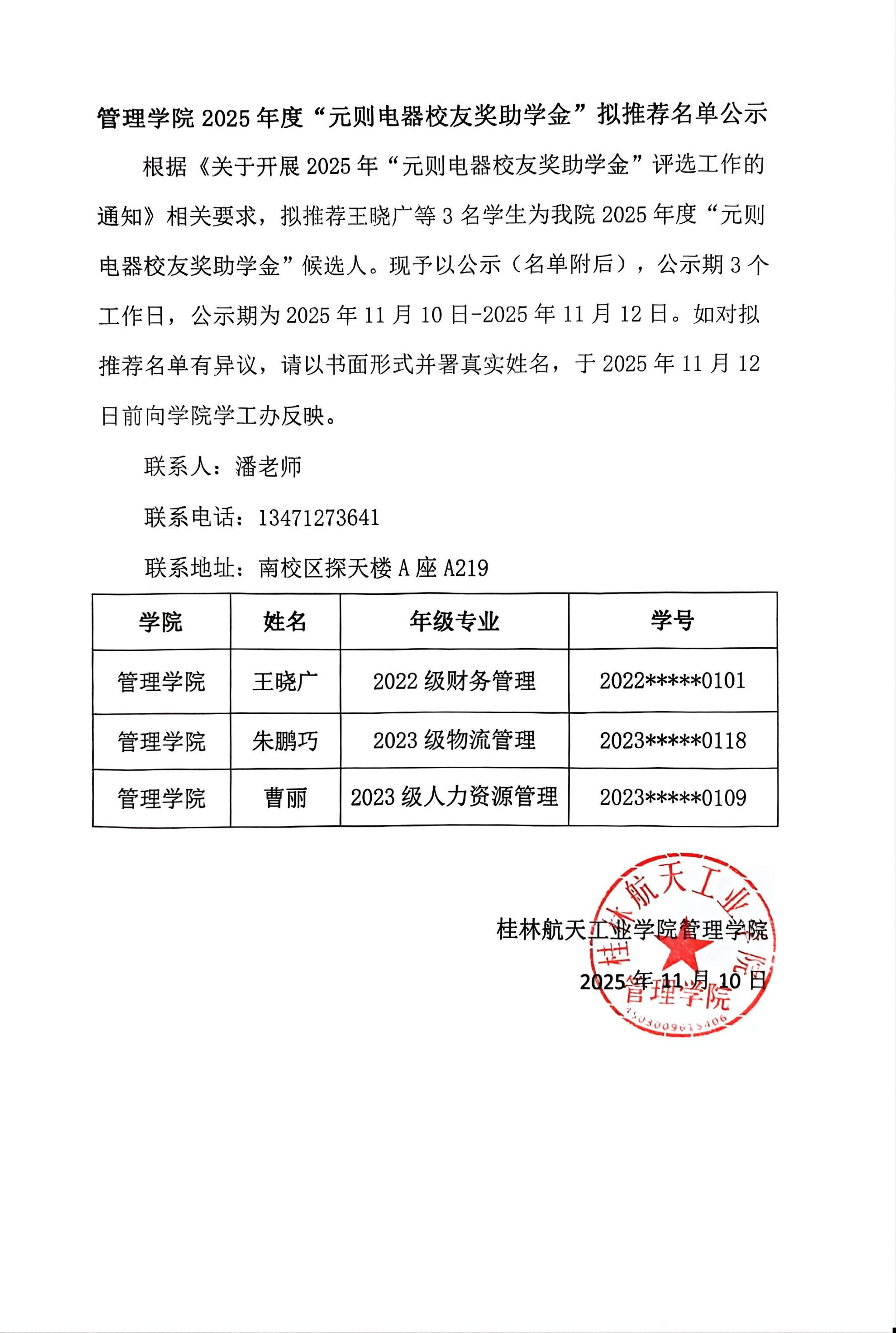 根据《关于开展2025年“元则电器校友奖助学金”评选工作的通知》相关要求,拟推荐王晓广等3名学生为我院2025年度“元则电器校友奖助学金”候选人。现予以公示(名单附后),公示期3个工作日,公示期为2025年11月10日-2025年11月12日。如对拟推荐名单有异议,请以书面形式并署真实姓名,于2025年11月12日前向学院学工办反映。