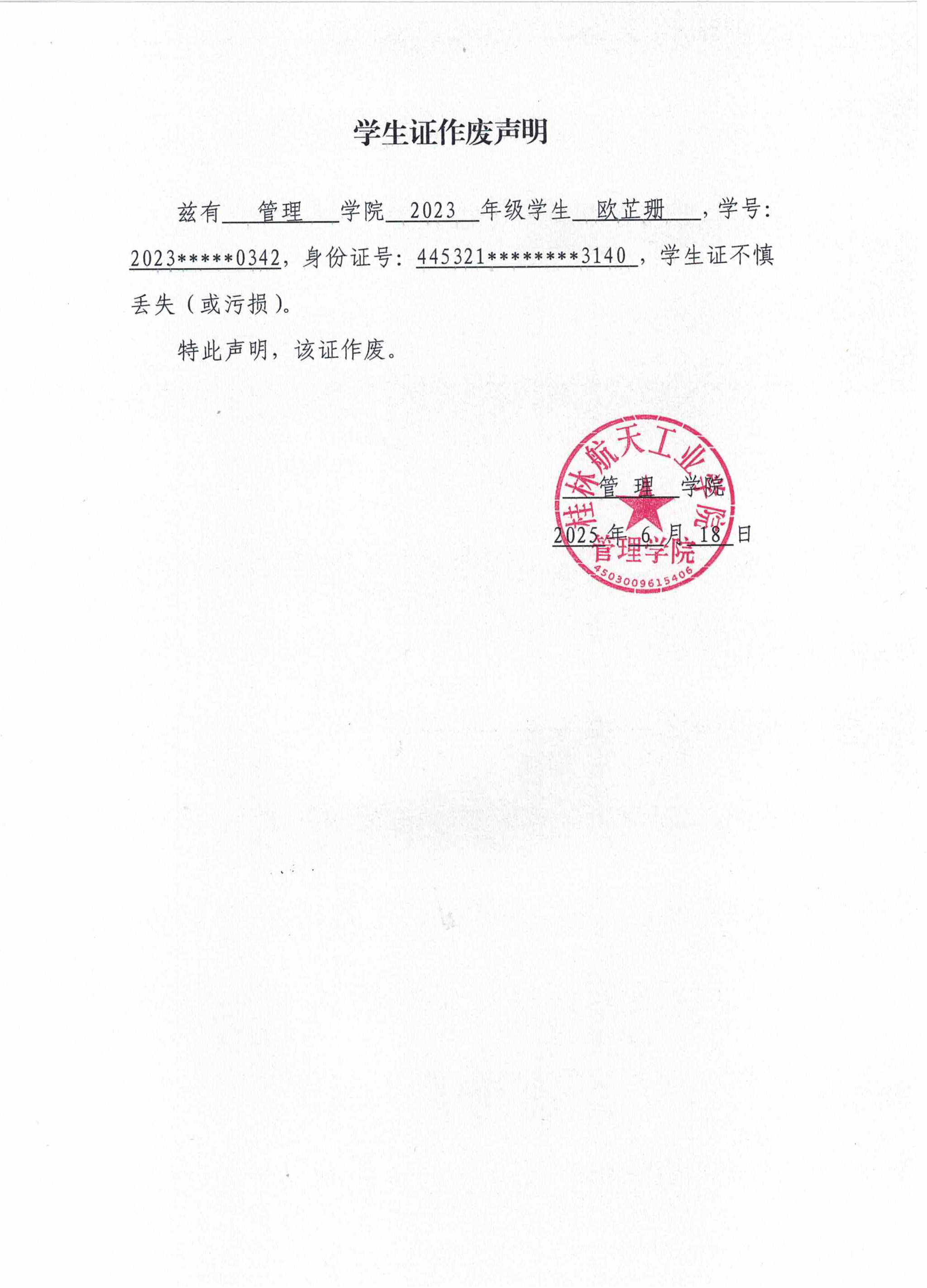 欧芷珊学生证作废声明