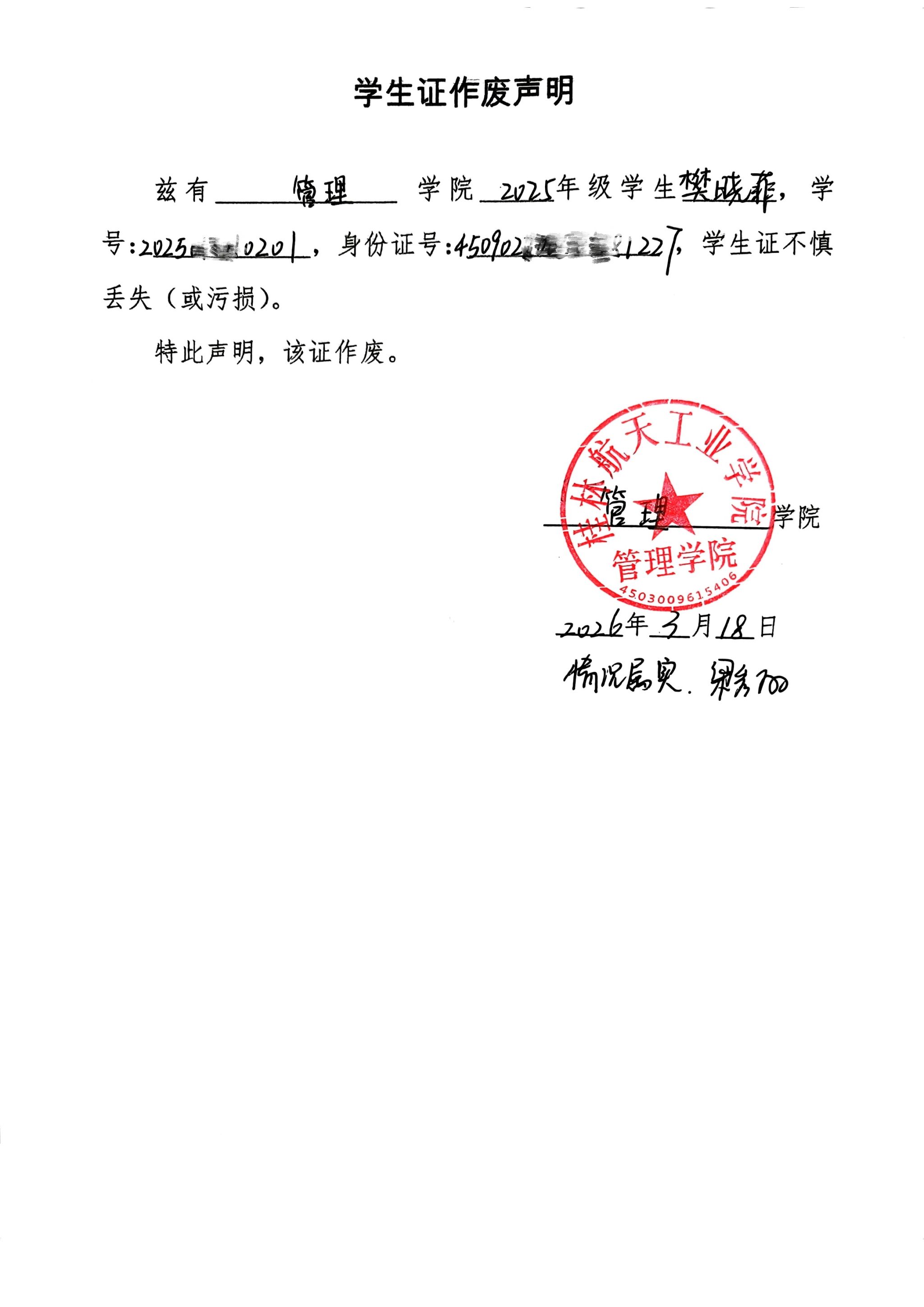 黄耀壮学生证作废声明