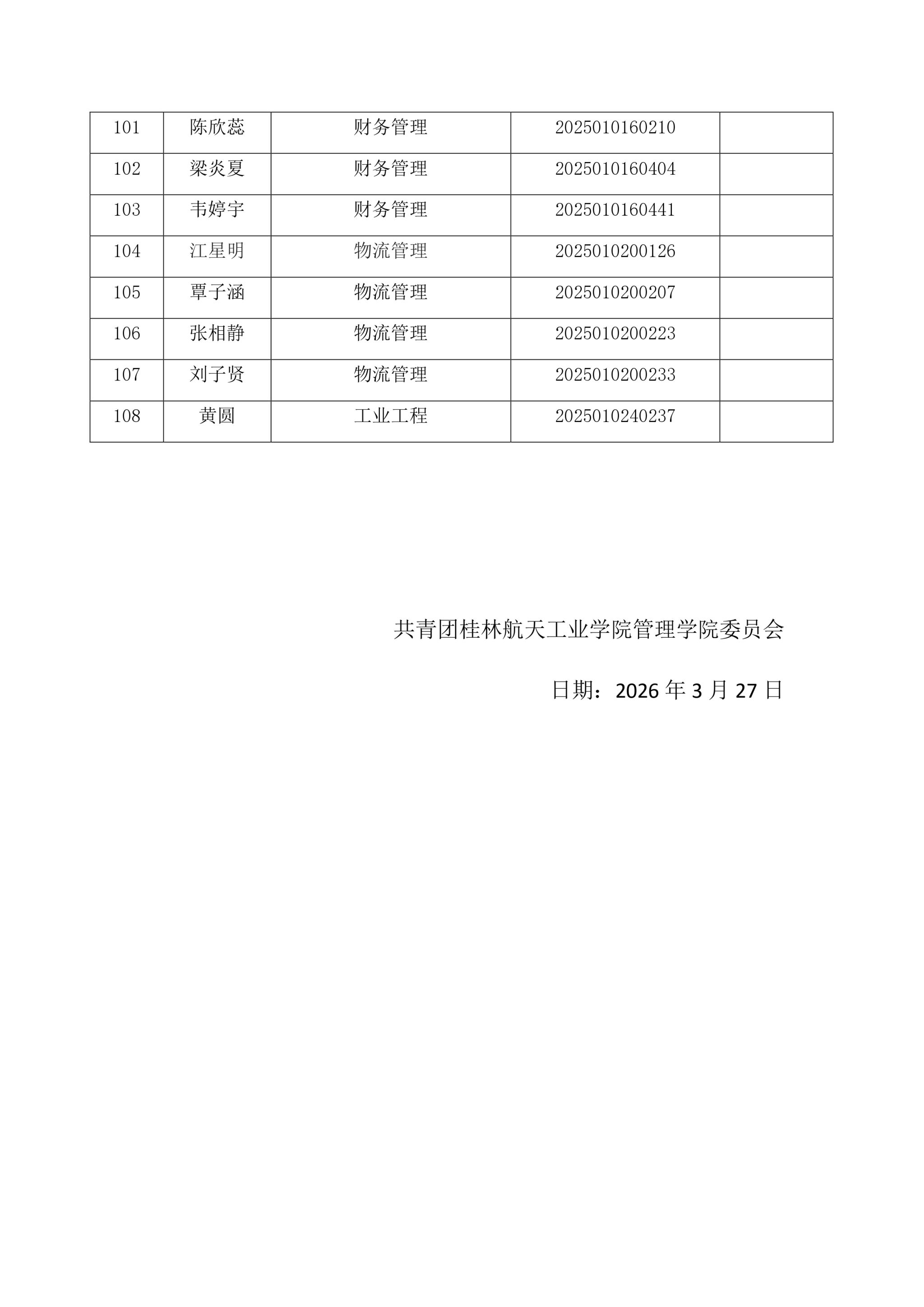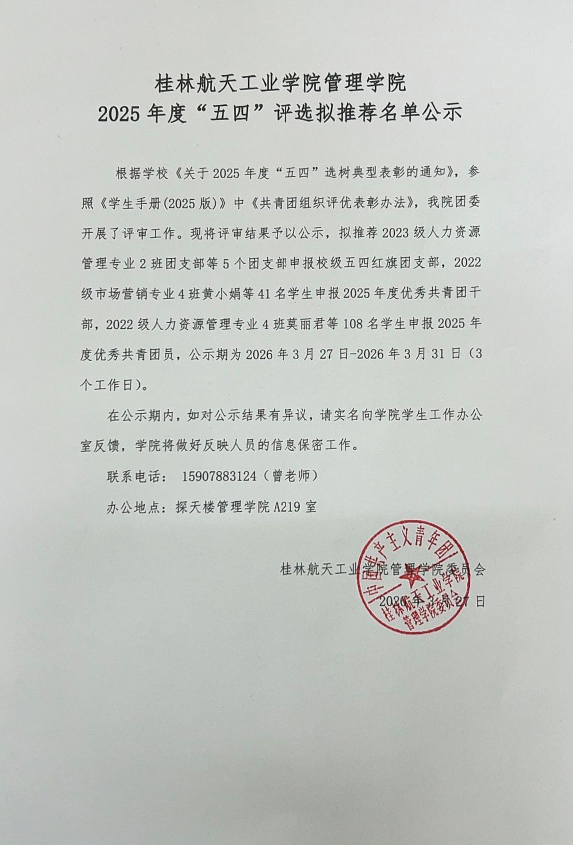 桂林航天工业学院管理学院 2025年度“五四”评选拟推荐名单公示